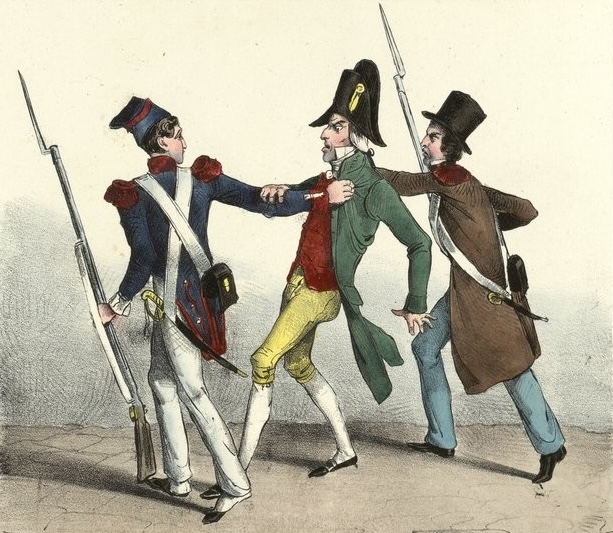 Above: Victor Ratier, “Arrestation de Polignac,” circa 1830. Public domain via Bibliothèque Nationale de France. A caption accompanying the original image reads: “‘My good friends, when I tell you that I am and have never been anything but a servant!’ ‘—Yes, of Wellington and Company, let’s go! You seem so stupid and so well-bred that you could only be a Polignac.’”